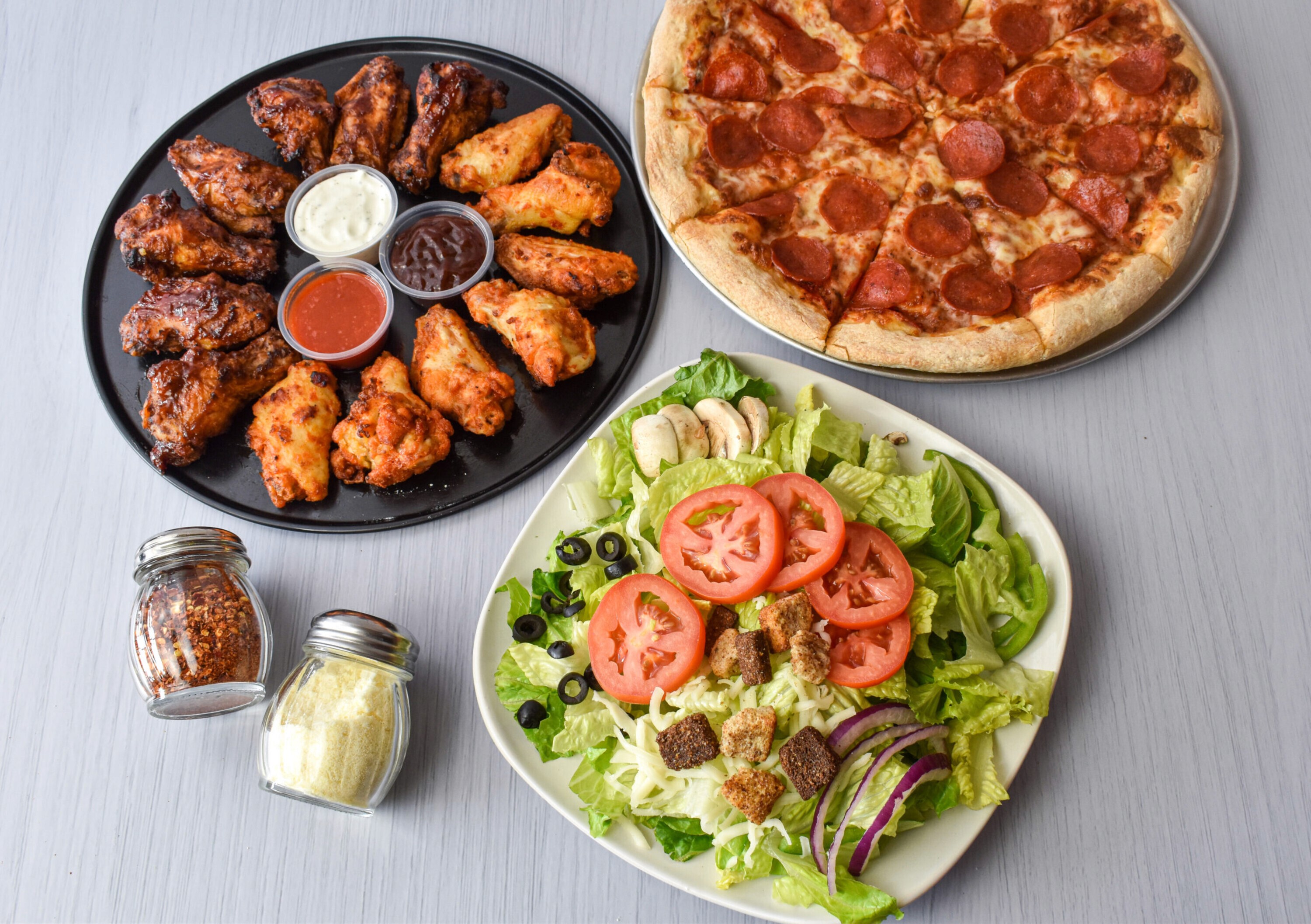 Marinara Sauce – Classic, rich, and tangy. White Sauce – Creamy and indulgent. Served with: Hot, Fresh Breadsticks – Warm and delicious! Side Salad – Fresh and crisp!